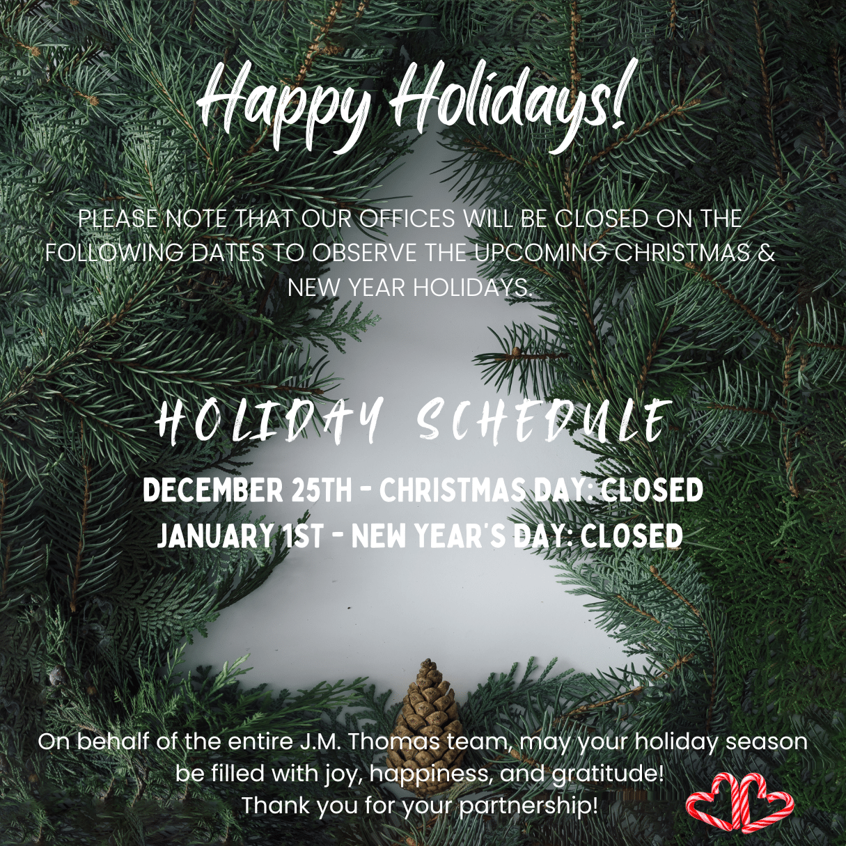 Ahhh.. December in the building industry! Such a blend of practical realities - weather, deadlines, year-end pressure, inventory pressure, paired with a warm spirit that comes from holiday traditions. And while we are all hanging our stockings with care, and decking the halls, we also are watching the seasonal slow downs, and weather challenges that are coming our way. We are working to tie up loose ends so we can start January with a clean slate, it's also a heavy month for strategy and preparation for the New Year. Locking in agreements, forecasting demand, planning education and safety refreshers, team meetings, performance evaluations, and next-year goal setting. So much to do! But through all of this end of year and holiday madness, we hope you have a chance to enjoy the small things, the things that make it big. Enjoying the holiday season by putting up Christmas tree's, lights or wreath's in your offices. Host holiday lunches, celebrate accomplishments, reflect on challenges that you've overcome and most importantly find ways to acknowledge how hard your teams work year-round. At J.M. Thomas, it's about our people and our partners. We are grateful this holiday season and more so each and every day that we show up for each other to provide the best Service, Quality, & Commitment in the industry! Wishing you all a very Merry Christmas and a wonderful holiday season!